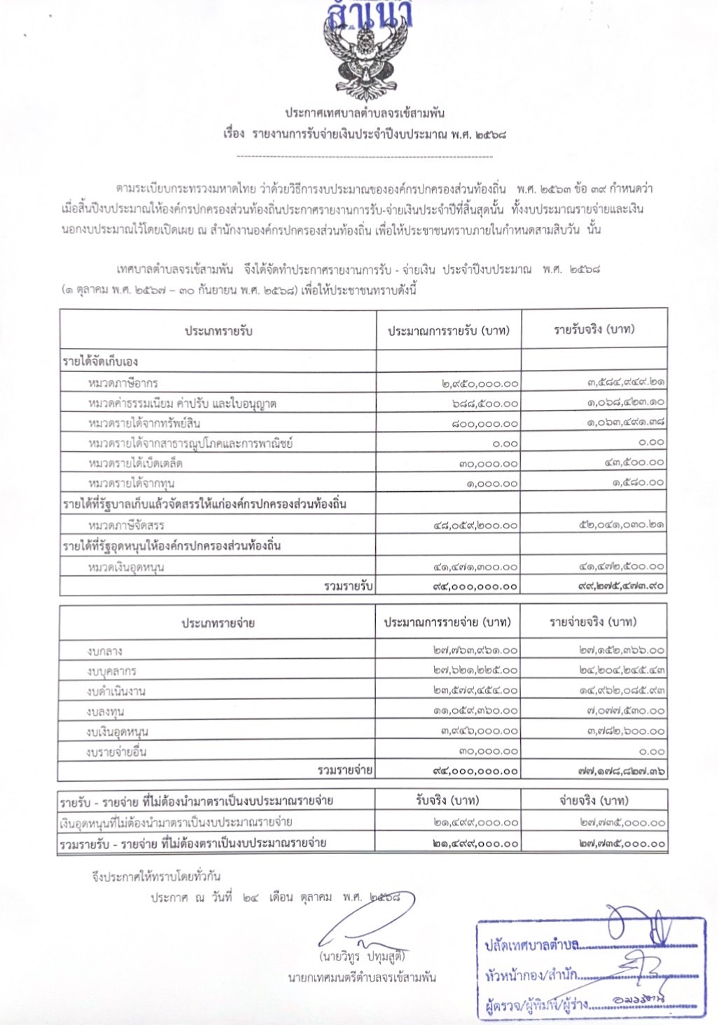 ประกาศเทศบาลตำบลจรเข้สามพัน เรื่อง รายงานการรับจ่ายเงินประจำปีงบประมาณ พ.ศ. 2568
